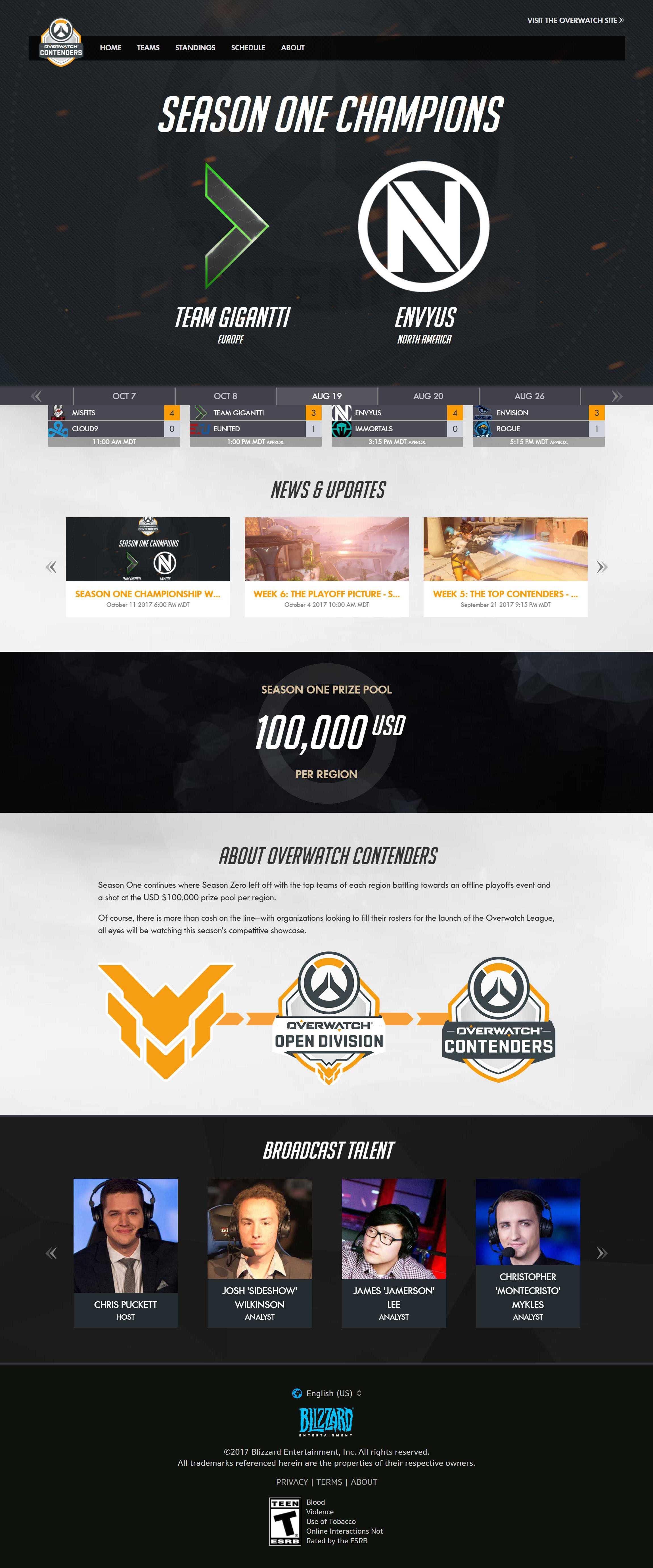 Overwatch Contenders is a high-level tournament series for aspiring pro players who dream of ascending to the Overwatch League. Blizzard Entertainment partnered with Carbon Entertainment for execution of Season Zero and One in North America and Europe. I lead our team to create any necessary graphics for this project in addition to the base broadcast package Blizzard provided. This included new broadcast assets with graphics, intro bumpers, and set elements, in addition to static graphics such as the website, twitch banners, news headers, and game launcher buttons. We worked off an existing broadcast asset package, and integrated it into CharacterWorks for live production.